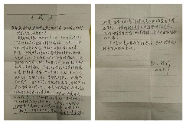 8月16日,一位姓程的用戶到供熱一所勝利路收費點辦理停暖業務,當時正是亢竹星辦理業務,在得知用戶是從外地專門回來辦理停暖業務的時候,他立即幫助用戶填寫申請表,并及時溝通維修師傅安排上門進行斷管,于第二天一早便完成了斷管工作。這位用戶非常暖心,于是便寫來了表揚信,向供熱一所及這位員工表示感謝。