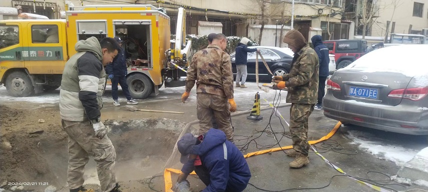 2月21日早上7點(diǎn),祥泰熱力站員工在站內(nèi)巡檢時發(fā)現(xiàn)壓力波動異常,補(bǔ)水泵變頻增高,經(jīng)過一個多小時的巡檢排查后發(fā)現(xiàn)是金都園小區(qū)院內(nèi)路面有滲水,初步判斷為直埋管破裂導(dǎo)致跑水,該處漏點(diǎn)直接影響祥泰站和成小區(qū)1.2萬平方米用戶正常用熱。光華供暖所所長姚曉飛得知情況后迅速聯(lián)系分公司搶修人員到達(dá)現(xiàn)場,由于當(dāng)時正在下雪,路面結(jié)冰,給搶修工作增加了難度,搶修人員采用挖掘機(jī)與人工開挖查找漏點(diǎn),經(jīng)過40多分鐘的挖掘發(fā)現(xiàn)DN200主管腐蝕嚴(yán)重導(dǎo)致漏水,搶修人員使用焊接的方式堵住漏點(diǎn),恢復(fù)供熱。