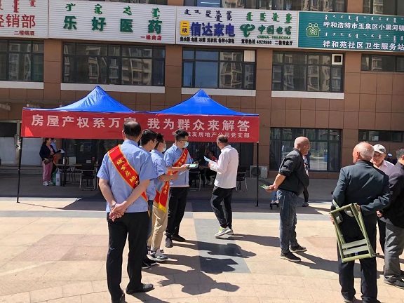 在祥和苑公租房小區(qū)社區(qū)服務中心,志愿者們向廣大群眾詳細的介紹了公租房購買條件和流程,以及辦理不動產(chǎn)權(quán)證等政策知識,并為購房群眾現(xiàn)場發(fā)放了辦理不動產(chǎn)權(quán)證的發(fā)票和網(wǎng)簽合同。同時大家還主動前往小區(qū)人流較多的北門,熱情的向廣大群眾發(fā)放了公司專門制作的公租房銷售和不動產(chǎn)權(quán)證宣傳圖冊,耐心的為群眾解答購買公租房和辦理產(chǎn)權(quán)政策的各項疑慮、困惑。